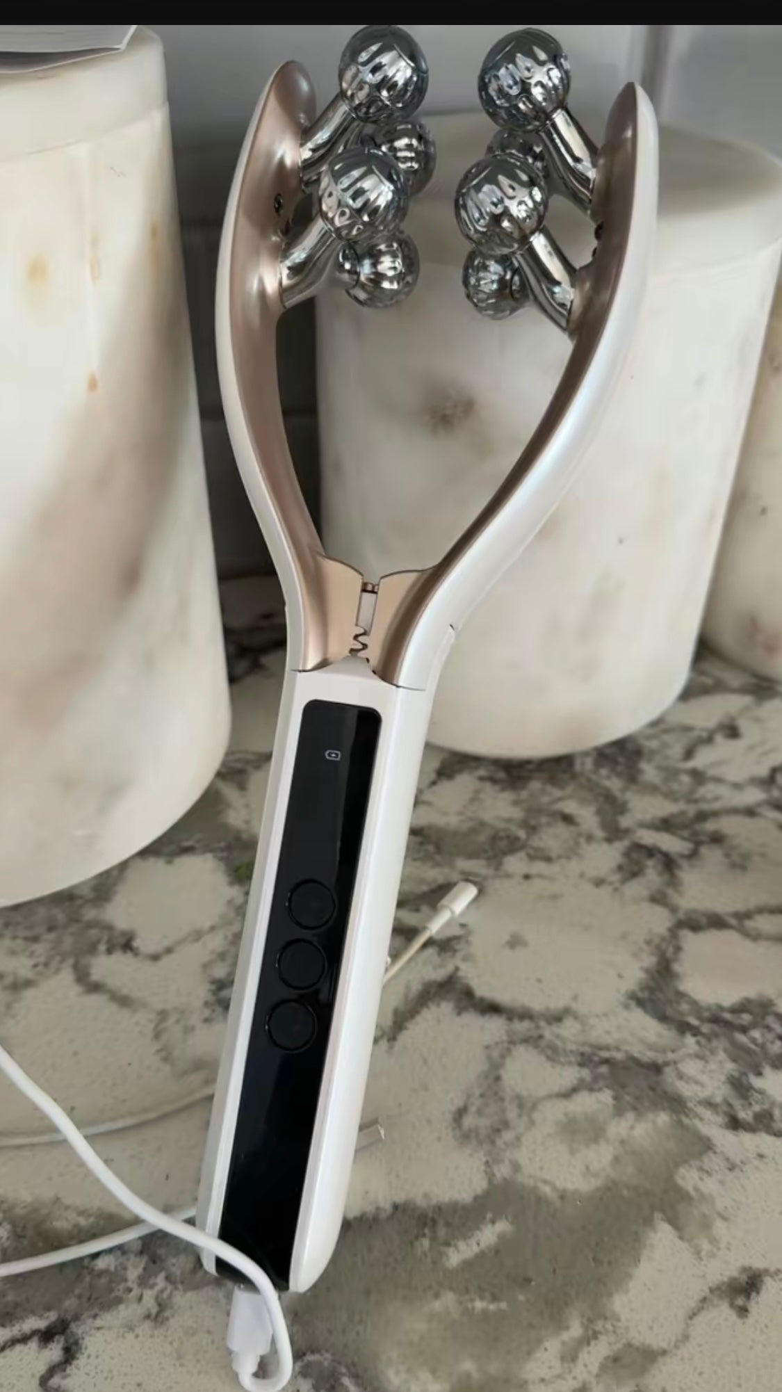 Absolutely. Use gentle pressure under the eyes, then roll upward along the jawline and down the neck (many customers love it there for tension + a more sculpted look)